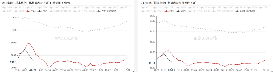 需求:中性 247家钢厂铁水日均产量227.5万吨,周环比-0.5万吨,铁水回升较快,铁水保捏同比偏高水平但环比回落,短期内增产空间不大,对原料煤焦刚需撑捏偏弱。